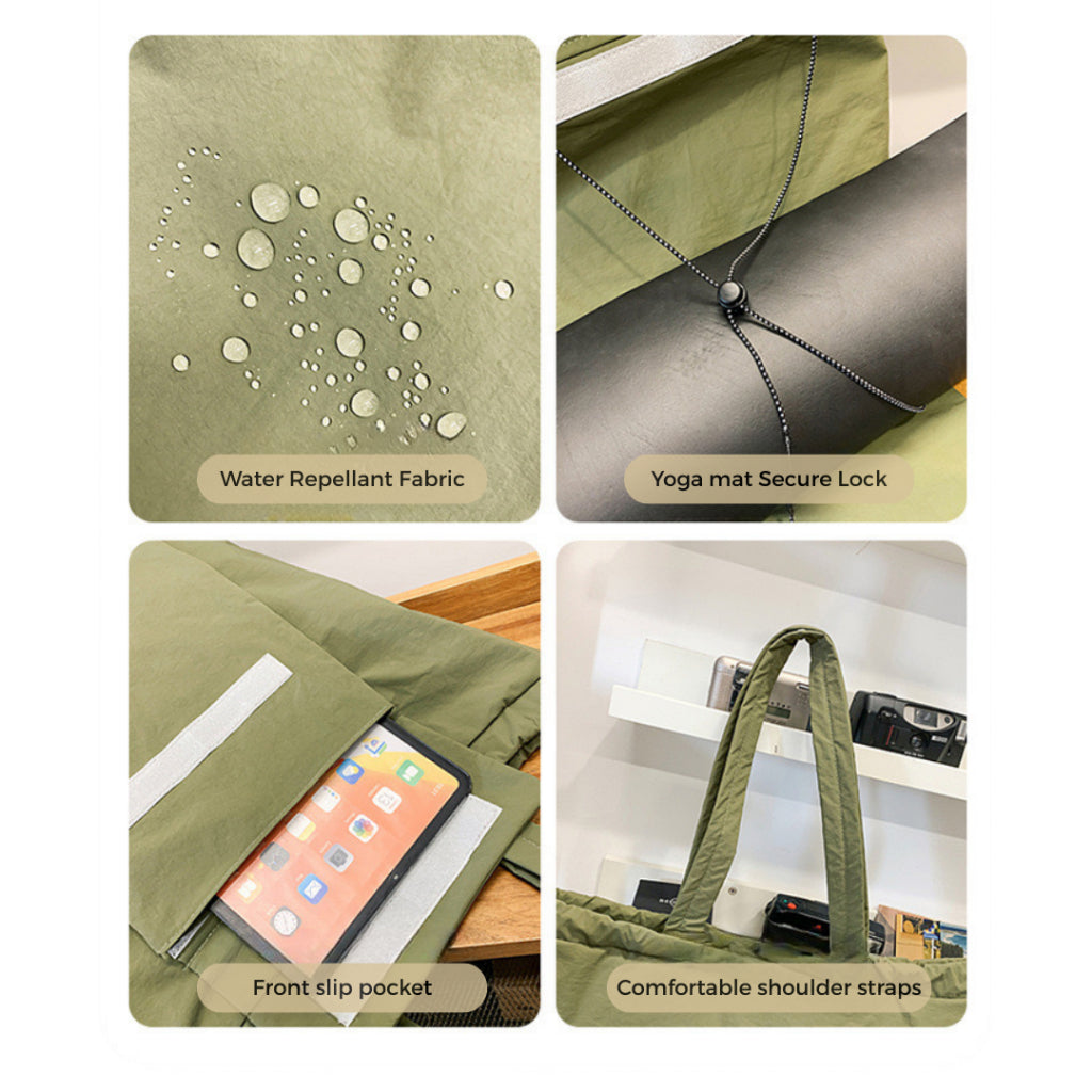 The Light Multipurpose Shoulder Yoga Mat Bag is a lightweight, water-resistant nylon tote designed for everyday use. It features a spacious main compartment, a front slip pocket for quick access, an internal zipper pocket for valuables, and a built-in holder to securely carry your yoga mat. Comfortable shoulder straps and a clean, minimal design make it ideal for yoga, gym, work, or daily errands. Available in Cream, Light Pink, Green, and Black.